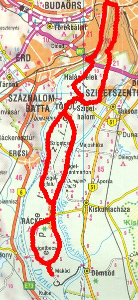 A Csepel-szigeten: Budapest - Szigetszentmiklós - Szigethalom - Tököl - Szigetcsép - Szigetszentmárton - Ráckeve - Szigetbecse - Makád - Lórév - Ráckeve - Szigetújfalu - Tököl - Szigethalom - Halásztelek - Budapest (110 km)