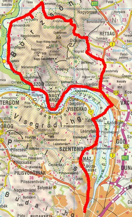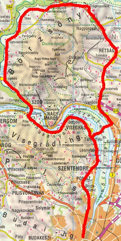 Nógrádi vár (Börzsönyi túra): Budapest (vonat, egyébként 45 km) - Vác - Verőce - Kismaros - Nagymaros (63 km) - Zebegény - Szob - Márianosztra - Ipolydamásd - Letkés - Ipolytölgyes - Vámosmikola - Perőcsény - Kemence - Királyháza - Diósjenő - Nógrád - Szendehely - Vác - Budapest (200 km)