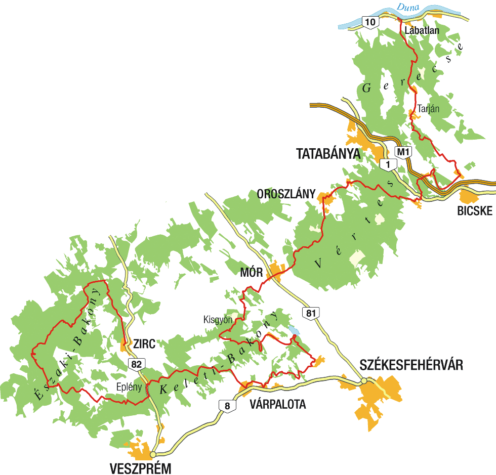 Zirc - Vinye - Kőris-hegy - Hárskút - Eplény - Alsóperepuszta - Várpalota - Baglyas-hegy - Iszkaszentgyörgy - Fehérvárcsurgói-víztározó - Isztimér - Hamuház - Kisgyón - Mecsértelep - Mór - Pusztavámi-Ipartelepek - Oroszlány - Vértessomló - Szár - Óbarok - Csabdi - Somlyó-hegy - Tarján - Héreg - Pusztamarót - Lábatlan